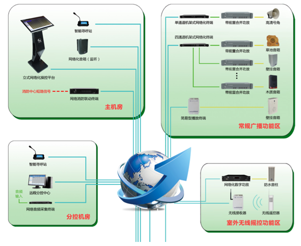 根據校方的需求,學校廣播採(cǎi)用點對點可尋址廣播系統,實現可對每一間教室、每一間辦(bàn)公室以及操場等區域進行單獨廣播,組合廣播,老師或學生可在廣播控制室進行本地廣播或在辦(bàn)公室進行遠程廣播。