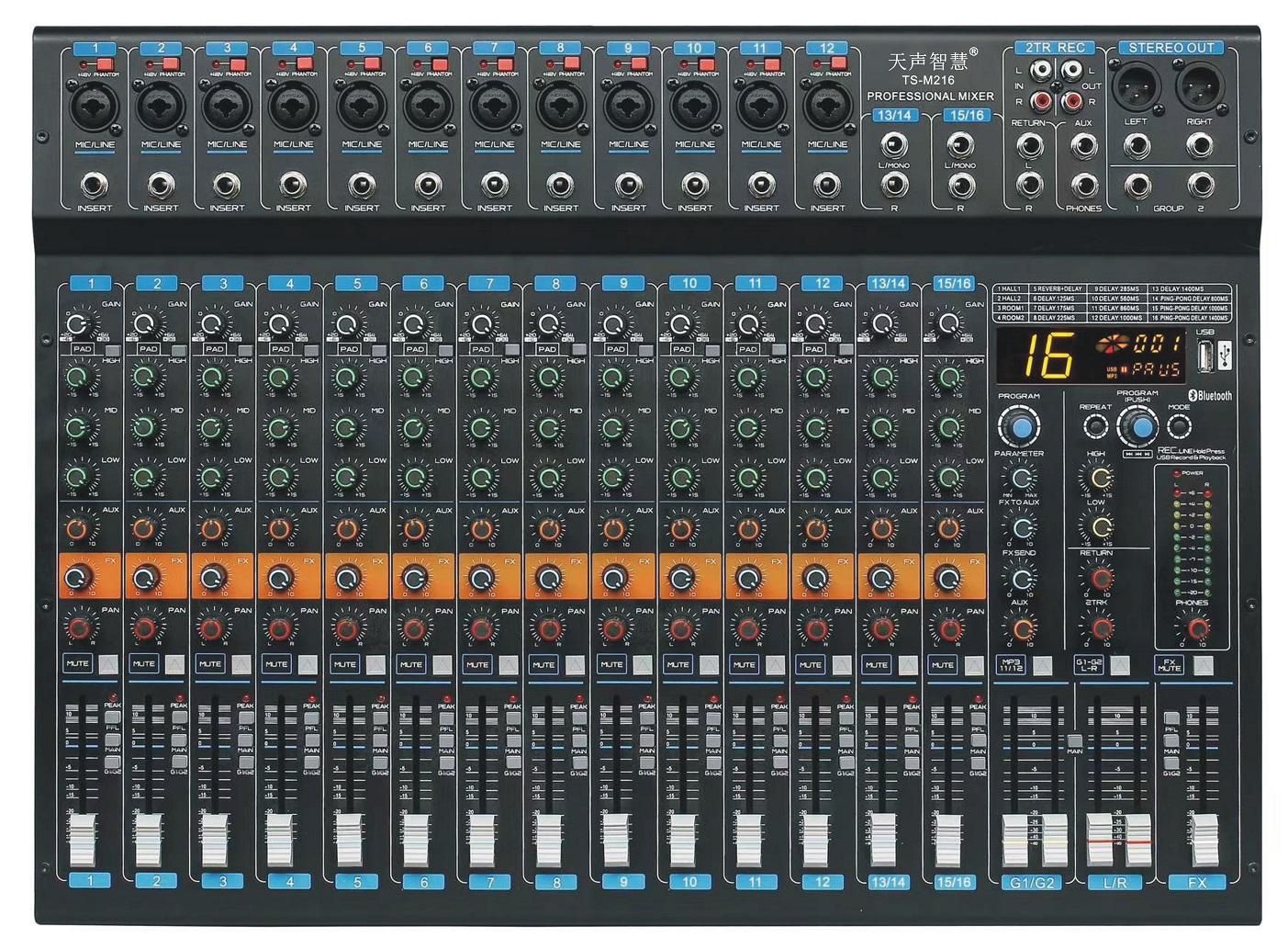 1、專業調音台,麥克風低噪聲放大器電(diàn)路,十二路單(dān)獨+48V幻象電源開啓或關閉;
